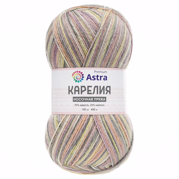 Пряжа "Карелия" от Astra Premium – прекрасный выбор для вязания носков. Сочетание шерсти и нейлона – традиционное для носочной пряжи. В составе 25% нейлона, поэтому носки из этой пряжи практичны, выдерживают частые стирки и прослужат вам не один сезон. Благодаря большому содержанию шерсти вещи из 'Карелии' отлично согревают в холодную погоду. Нить тонкая, поэтому носки получаются не слишком объемными, их можно носить с разной обувью.