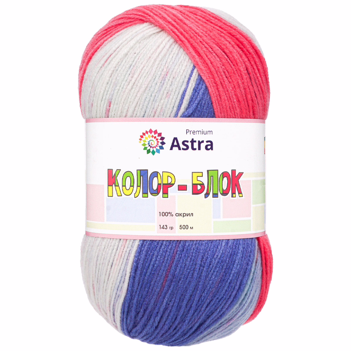 Пряжа от Astra Premium с длинными секциями позволяет создавать вещи в стиле "Колор-блок" (Color-block). Особые навыки при этом не нужны, подбирать цвета и каждый раз ввязывать новую нить не требуется. Работайте в простой технике "лицевая гладь", и у вас получится модное многоцветное полотно! Моток немного больше стандартного, поэтому его хватит на небольшое изделие – шарф, шапку, носки.