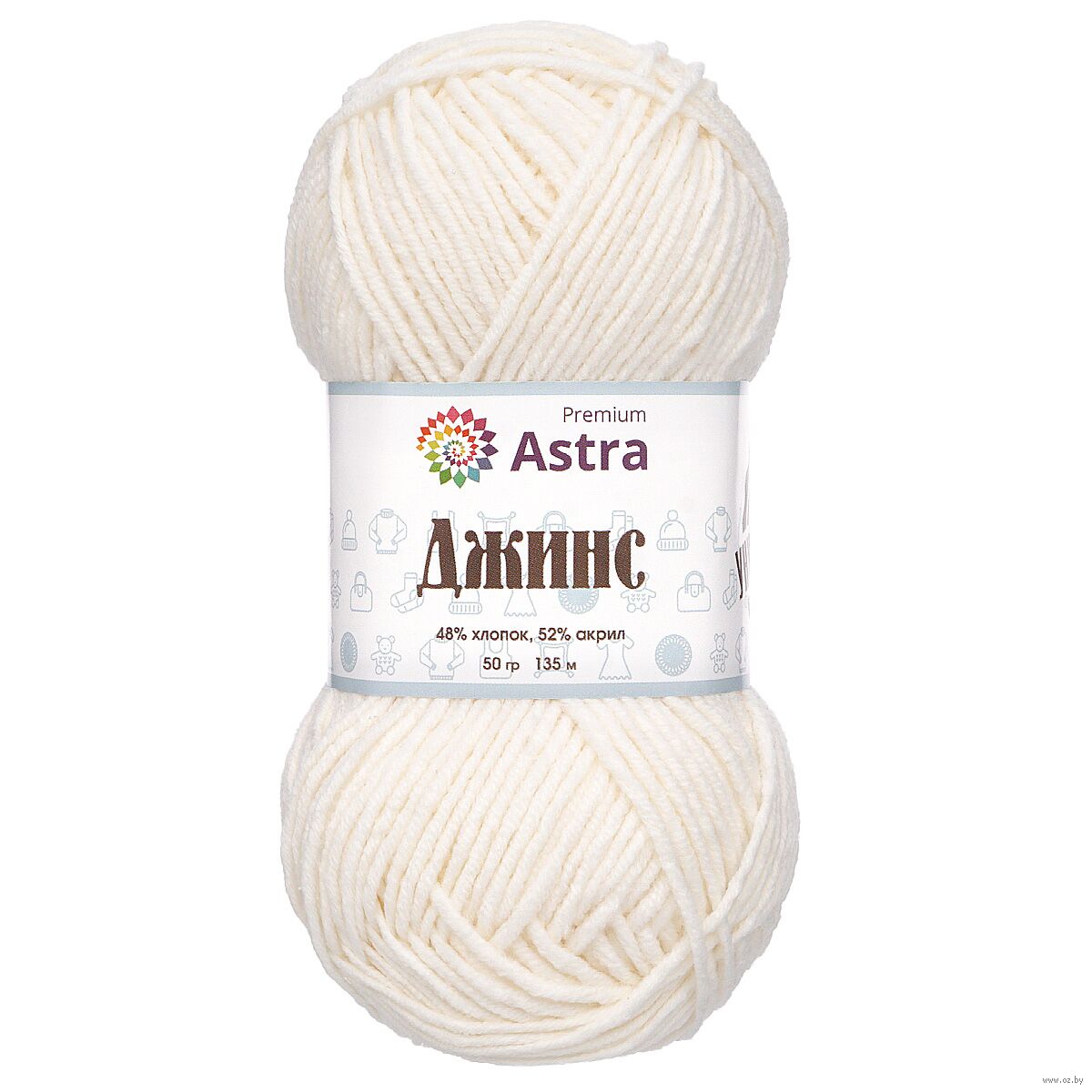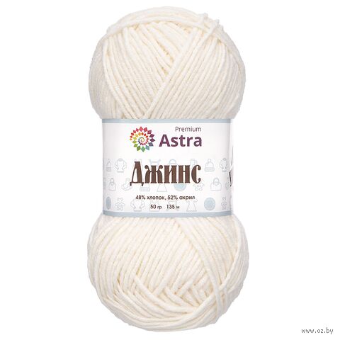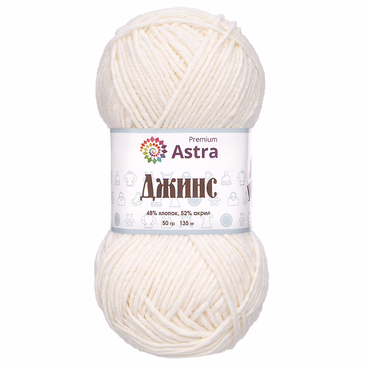 "Джинс" от Astra Premium – удачный выбор для создания практичных вещей в повседневном стиле. Пряжа универсальная, подходит для вязания шапочек, носков, свитеров, мягких игрушек. Продается небольшими мотками по 50 г. Чтобы связать свитер для взрослого, понадобится около 450 г пряжи, или 9 мотков.
