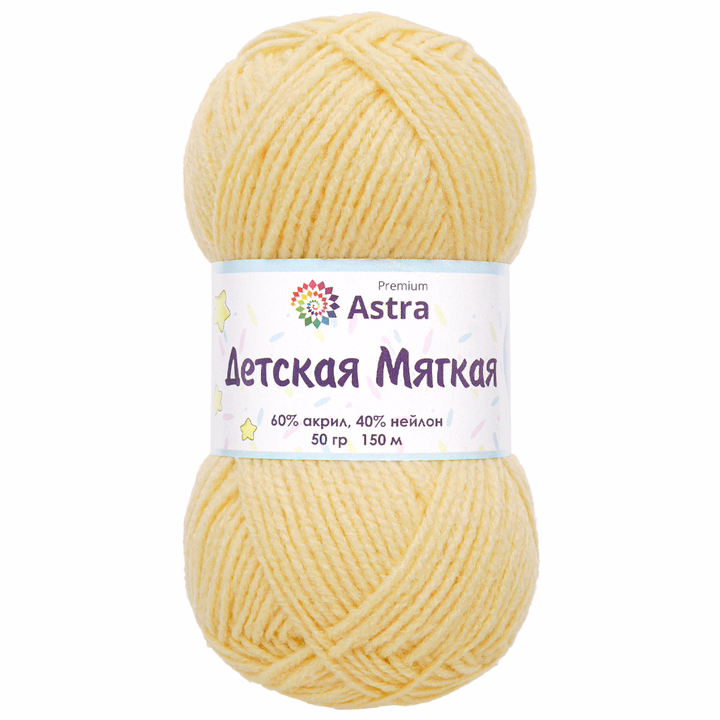 Пряжа Astra Premium "Детская мягкая" имеет приятную на ощупь и деликатную фактуру благодаря слабо выраженной крутке и особенностям материалов. Акрил и нейлон отличаются мягкостью, не вызывают аллергии и безопасны для нежной детской кожи. Нить с небольшим пушком, стабильная и пластичная. Вязаное полотно получается в меру тонким и немного рельефным. Готовые вещи выглядят нарядно благодаря продуманной цветовой палитре.