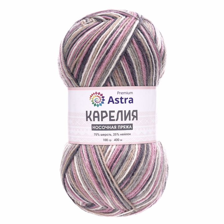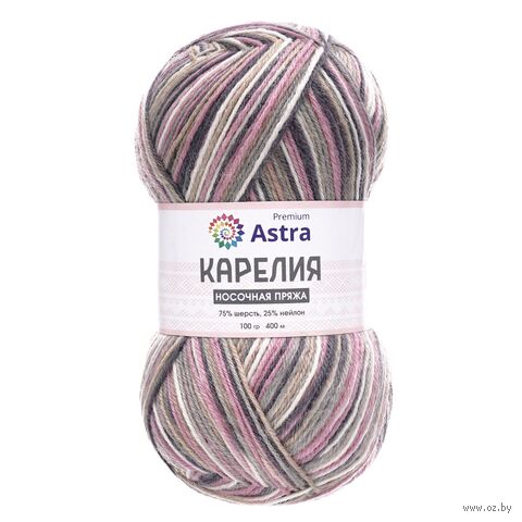 Пряжа "Карелия" от Astra Premium – прекрасный выбор для вязания носков. Сочетание шерсти и нейлона – традиционное для носочной пряжи. В составе 25% нейлона, поэтому носки из этой пряжи практичны, выдерживают частые стирки и прослужат вам не один сезон. Благодаря большому содержанию шерсти вещи из 'Карелии' отлично согревают в холодную погоду. Нить тонкая, поэтому носки получаются не слишком объемными, их можно носить с разной обувью.
