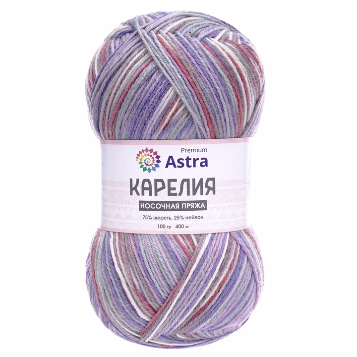 Пряжа "Карелия" от Astra Premium – прекрасный выбор для вязания носков. Сочетание шерсти и нейлона – традиционное для носочной пряжи. В составе 25% нейлона, поэтому носки из этой пряжи практичны, выдерживают частые стирки и прослужат вам не один сезон. Благодаря большому содержанию шерсти вещи из 'Карелии' отлично согревают в холодную погоду. Нить тонкая, поэтому носки получаются не слишком объемными, их можно носить с разной обувью.